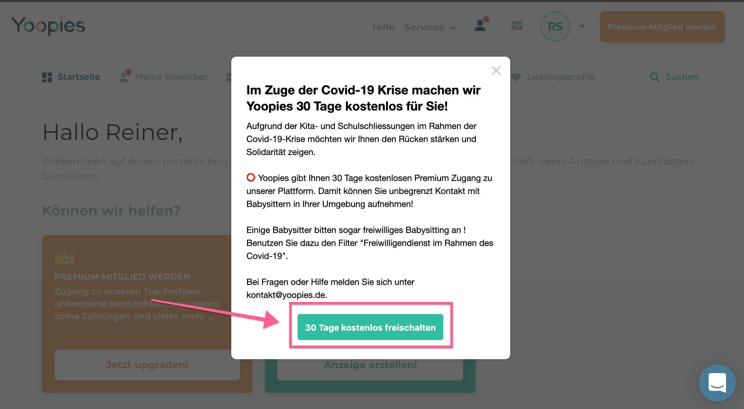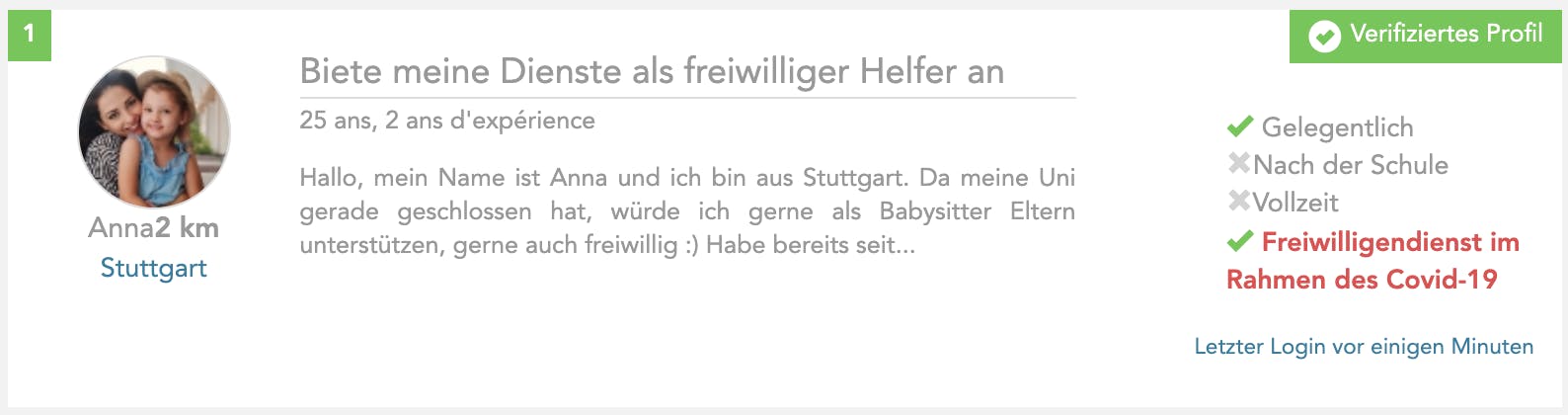 Daher haben wir die Aktion „Freiwilligendienst im Rahmen des Covid-19“ ins Leben gerufen. Kinderbetreuer können sich über einen Filter bei Yoopies kennzeichnen, dass sie als freiwillige Betreuer Eltern in Not unentgeltlich ihre Hilfe anbieten.